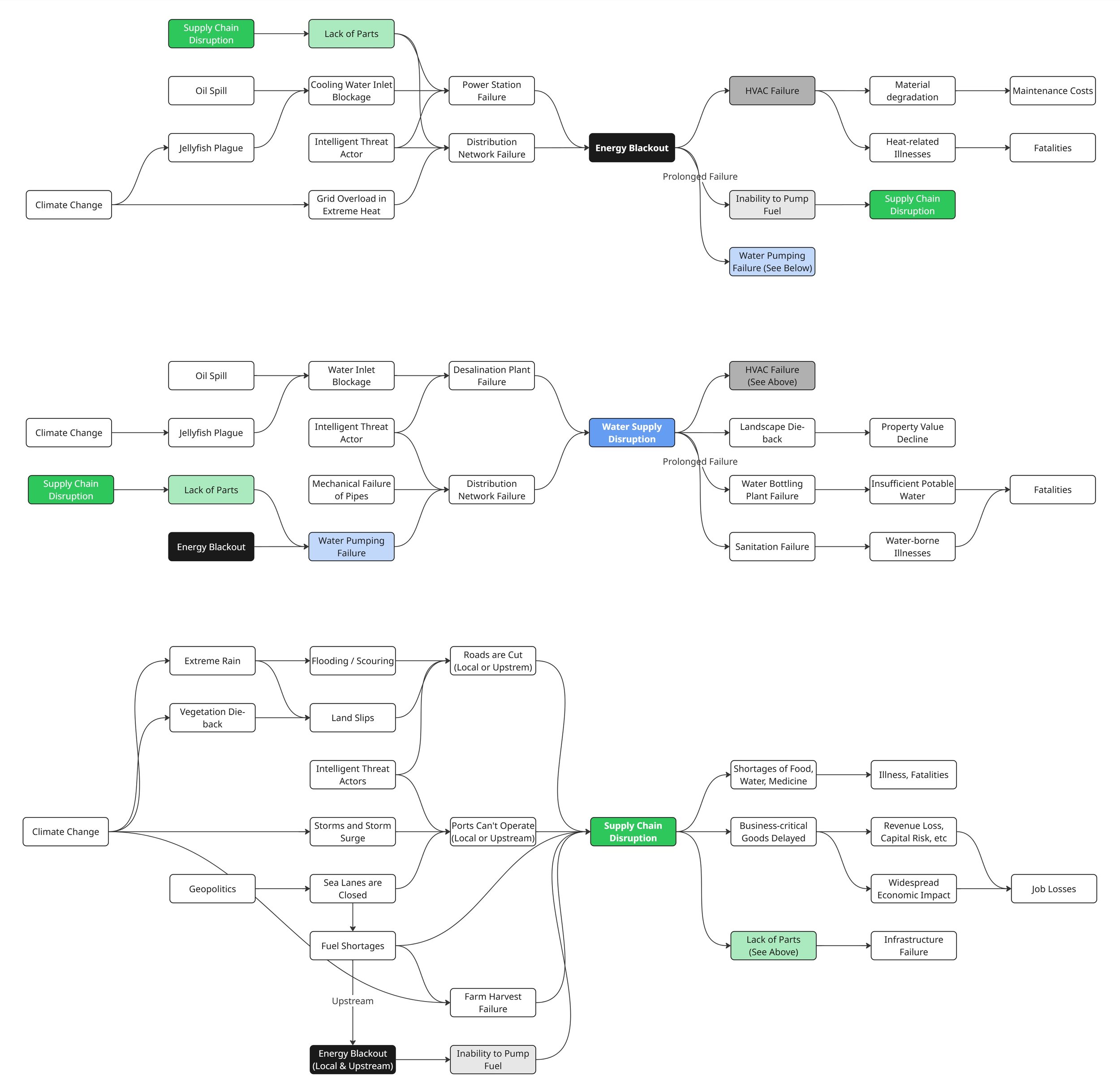 Primary concerns I've been highlighting on Middle Eastern projects include failure of the energy system, water network and supply chain logistics. The following is a vastly simplified map of potential failure mechanisms and consequences. As you can see, a lot can go wrong, so assuming the local government Utility will ensure supply is...optimistic. It is therefore best to be prepared.